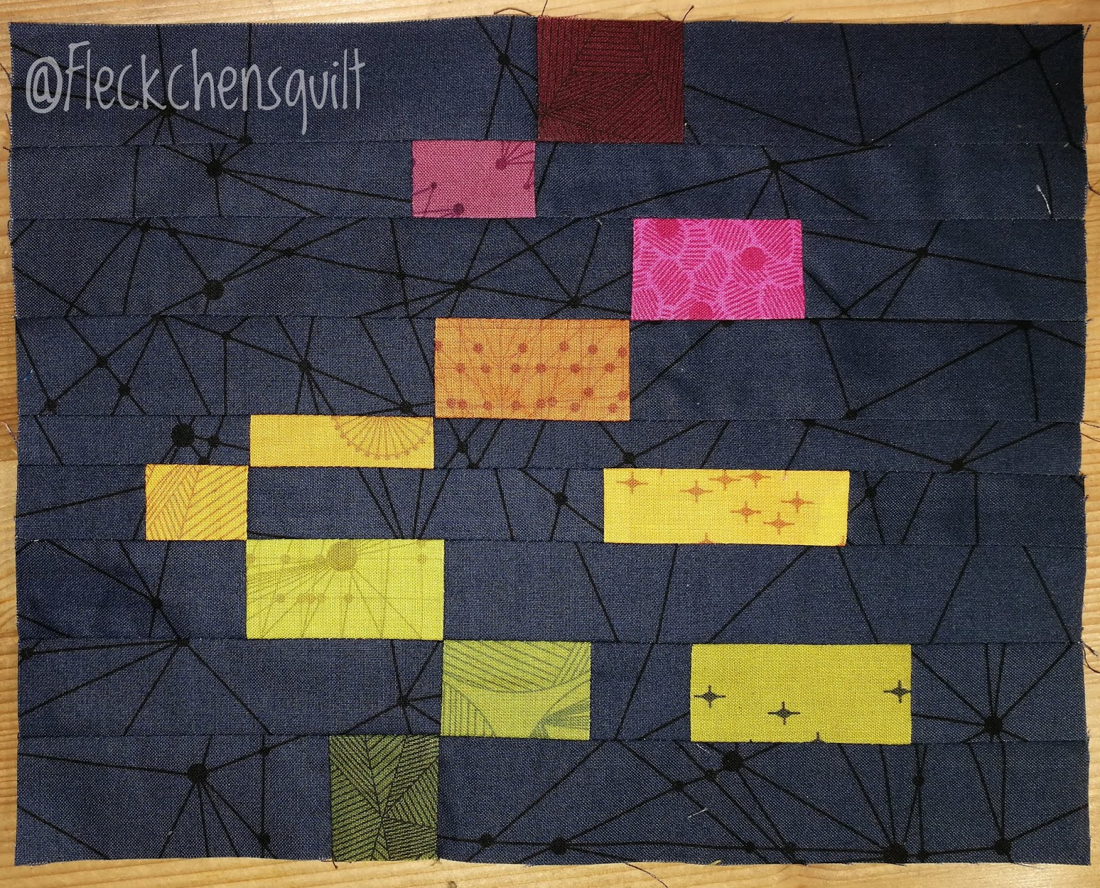 Ich bin ja Mitglied bei der Modern Quilt Guild Stuttgart. Elaine hat sich bereit erklärt, uns einen BOM zu kreieren. Das wirklich spannende ist, dass selbst sie nicht weiß, wie der Quilt am Ende aussehen wird und welche Blöcke noch kommen.